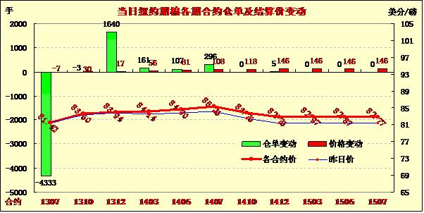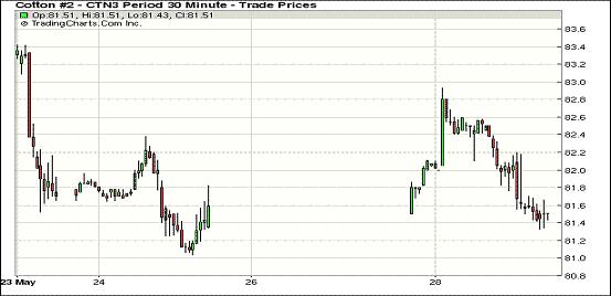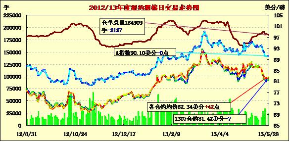 5月28日,紐約期棉除近期7月合約外普遍收漲,7月合約結(jié)算價81.42美分/磅,跌7點;12月合約結(jié)算價83.94美分/磅,漲17點;其他遠期合約漲幅56-146點不等。市場在周末小長假后小幅高開,主力7月合約早盤至當日最高點82.93美分/磅,后展期交易打壓該合約持續(xù)下行,盤終收于近四個月低點,該合約在過去12個交易中有10個交易日收跌。遠期合約受到外部谷物市場走高支持普遍收漲,盤面上后五份合約漲幅超過百點。