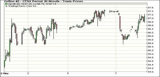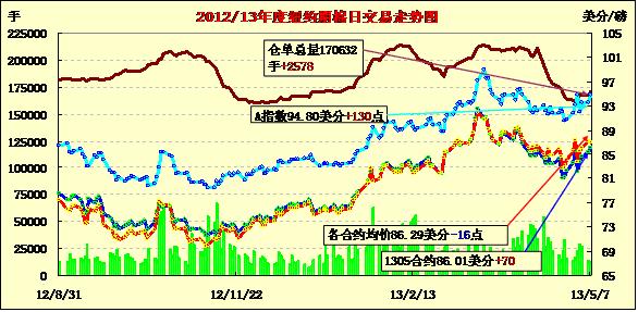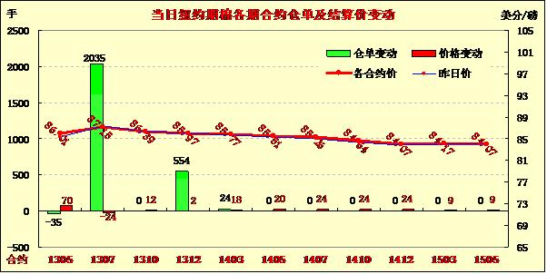5月7日,紐約期棉除主力合約小幅收低外,其他合約普遍收漲。近期5月合約結(jié)算價86.01美分/磅,漲70點;主力7月合約結(jié)算價87.15美分/磅,跌24點;12月合約結(jié)算價85.97美分/磅,漲2點。當日主力合約小幅低開后受賣盤打壓下行,早盤至當日最低點85.52美分/磅,后雖在買盤支持下收復(fù)部分失地,盤終仍以陰跌收盤。遠期12月合約當日運行平穩(wěn),7/12月合約價差118點。近期5月合約將于本周三進入最后交易日,目前尚有未平倉合約54張。因美國各棉區(qū)天氣情況不一導(dǎo)致各方對美下年度棉花總產(chǎn)預(yù)測偏差較大,市場密切關(guān)注美國農(nóng)業(yè)部將于10日公布最新全球棉花供需預(yù)測報告。
