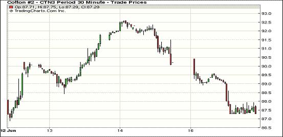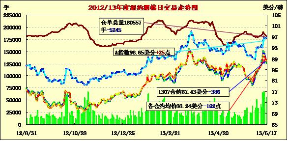6月17日,紐約期棉前三份合約收跌,近期7月合約結(jié)算價87.43美分/磅,跌386點(diǎn);10月合約結(jié)算價89.04美分/磅,跌160點(diǎn);主力12月合約結(jié)算價88.99美分/磅,跌45點(diǎn);其他遠(yuǎn)期合約普遍小幅收漲。市場成交持續(xù)活躍。當(dāng)日近期7月合約早盤低開(-88點(diǎn))并在89-89.5美分/磅之間震蕩,因臨近交割期,多頭平倉打壓該合約大幅回落,盤中觸及跌停板87.29美分/磅(-400點(diǎn));交易后半段在87.5美分一線波動,盤終幾近跌停。主力12月合約當(dāng)日震蕩幅度208點(diǎn),盤終較7月合約升水156點(diǎn)。整體市場呈近弱遠(yuǎn)強(qiáng)格局,仍處于上行趨勢中。
