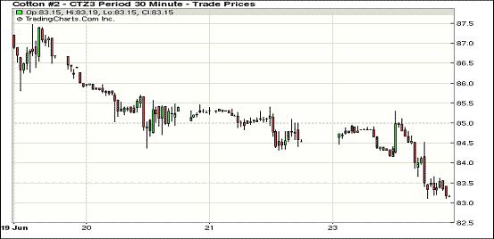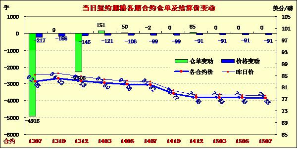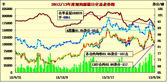 因市場(chǎng)擔(dān)心中國(guó)信貸吃緊狀況將制約需求,紐約期棉繼上周錄得一年最大單周跌幅后 ,本周一繼續(xù)走低,近期7月合約結(jié)算價(jià)82.98美分/磅,跌217點(diǎn);主力12月合約結(jié)算價(jià)83.18美分/磅,跌146點(diǎn);其他遠(yuǎn)期合約跌幅91-121點(diǎn)不等。當(dāng)日市場(chǎng)開盤后受賣盤打壓下行,主力合約在一波空頭回補(bǔ)買盤支持下反彈至85美分之上,后中國(guó)金融市場(chǎng)流動(dòng)性吃緊令投資 者擔(dān)心其對(duì)棉花需求放緩,同時(shí)市場(chǎng)擔(dān)心美聯(lián)儲(chǔ)可能縮減貨幣刺激措施,期棉受打壓在下半場(chǎng)回落,主力連續(xù)第六個(gè)交易日收跌,收于5月31日以來最低值。分析指出,在中國(guó)央行暗示不會(huì)采取決定性的措施來緩解信貸緊張局面之后,中國(guó)銀行間市場(chǎng)的流動(dòng)性將會(huì)吃緊。中國(guó) 是最大的棉紡市場(chǎng),放貸放緩可能會(huì)制約其對(duì)棉花的需求。