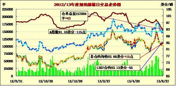 6月27日,因美國(guó)經(jīng)濟(jì)數(shù)據(jù)向好及德州熱浪引發(fā)市場(chǎng)對(duì)美棉減產(chǎn)的擔(dān)憂(yōu),紐約期棉多數(shù)合約反彈,主力12月合約結(jié)算價(jià)83.88美分/磅,漲18點(diǎn);近期7月合約因臨近交割期,當(dāng)日下跌55點(diǎn)至83.13美分/磅。當(dāng)日期棉小幅高開(kāi),主力12月合約早盤(pán)基本在83.8-84美分/磅之間震蕩,上周美棉簽約及裝運(yùn)量下降對(duì)市場(chǎng)影響不大,美國(guó)經(jīng)濟(jì)數(shù)據(jù)利好促使美國(guó)股市及多數(shù)商品市場(chǎng)上揚(yáng),同時(shí)德州旱情引發(fā)市場(chǎng)對(duì)美棉減產(chǎn)的擔(dān)憂(yōu),期棉市場(chǎng)在上述因素支持下反彈上漲。成交依然平淡,但較前一日增加。美國(guó)商務(wù)部的數(shù)據(jù)顯示,經(jīng)過(guò)季節(jié)性因素調(diào)整,上周首次申請(qǐng)失業(yè)救濟(jì)人數(shù)減少了9,000人,符合經(jīng)濟(jì)學(xué)家們的預(yù)期;5月個(gè)人個(gè)人收入增加了0.5%,增幅超過(guò)了經(jīng)濟(jì)學(xué)家們的預(yù)期,這些利好因素對(duì)市場(chǎng)形成支持。