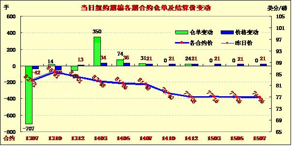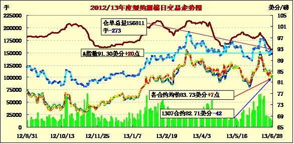 6月28日,美國(guó)農(nóng)業(yè)部(USDA)公布的美棉實(shí)播面積報(bào)告符合市場(chǎng)預(yù)期,紐約期棉近跌遠(yuǎn)漲,7月合約結(jié)算價(jià)82.71美分/磅,跌42點(diǎn);主力12月合約結(jié)算價(jià)84.01美分/磅,漲13點(diǎn)。市場(chǎng)成交清淡。當(dāng)日市場(chǎng)小幅高開(kāi),主力12月合約早盤(pán)在84.3-84.6美分/磅之間窄幅震蕩,下半場(chǎng)賣(mài)盤(pán)入市打壓市場(chǎng)下行,該合約當(dāng)日最低至83.31美分,震蕩幅度132點(diǎn),盤(pán)終微幅收漲。外部大豆及原油市場(chǎng)收漲,玉米及小麥?zhǔn)盏?。?jù)美國(guó)農(nóng)業(yè)部(USDA)6月28日發(fā)布的美棉2013/14年度實(shí)際種植面積報(bào)告,2013/14年度美棉實(shí)際種植面積約1025.1萬(wàn)英畝,同比減少18.6%,較USDA 3月份意向種植面積的1002.6萬(wàn)英畝增2.2%。