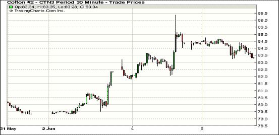 5月5日,市場未能延續(xù)前兩日強(qiáng)勁上漲勢頭,受美國德州將有更多降雨預(yù)期影響,近月合約整體下跌,近期7月合約結(jié)算價(jià)83.52美分/磅,跌104點(diǎn),12月合約84.90美分,跌54點(diǎn)。當(dāng)日市場小幅高開后早盤在84-85美分之間波動(dòng),盤中有賣盤打壓市場回落到83.5美分附近,下半場交易市場表現(xiàn)平淡,最終近月合約收于近低點(diǎn)。預(yù)計(jì)美國德州將迎來更多降雨,局部新棉生長將趨于正常,對期棉形成壓力,另外,7/12月展期交易打壓近期合約。