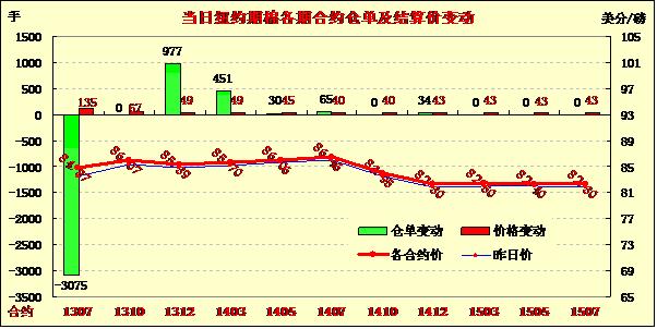 5月6日,紐約期棉市場反彈上揚,美棉出口周報利好對市場形成支持,近期7月合約結(jié)算價84.87美分/磅,漲135點,12月合約85.39美分,漲49點。當日7月合約低開后震蕩上揚,盤中試圖挑戰(zhàn)85美分失敗后在84.5美分一線窄幅波動,交易后期受美棉出口周報利好支撐穩(wěn)定于近高點,最終市場結(jié)束下跌全面上揚。外圍美元指數(shù)下跌,谷物期貨漲跌不一。據(jù)美國農(nóng)業(yè)部(USDA),5.24-5.30一周美國凈簽約出口本年度陸地棉41776噸,較前一周增57%,較近四周平均值增80%;裝運62732噸,較前一周減8%,較近四周平均值減1%;凈簽約本年度皮馬棉227噸,裝運6917噸,達到年度最高周裝運量,較前一周增77%,較近四周平均值增47%;凈簽約2013/14年度陸地棉31389噸?!  ?nbsp;