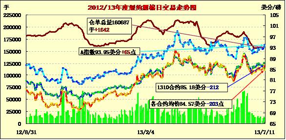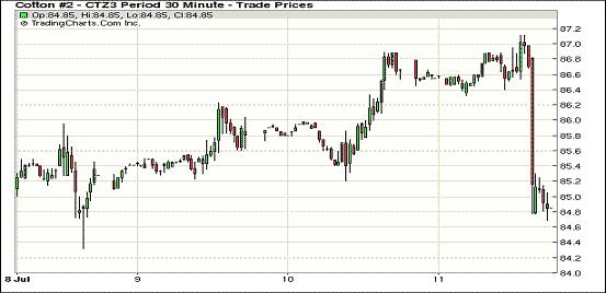 7月11日,受美國農(nóng)業(yè)部全球棉花供需預(yù)測報(bào)告利空影響,紐約期棉結(jié)束三連漲大幅回落,近期10月合約結(jié)算價(jià)85.18美分/磅,跌212點(diǎn);主力12月合約結(jié)算價(jià)84.74美分/磅,跌205點(diǎn);其他遠(yuǎn)期合約跌幅72-204點(diǎn)不等。當(dāng)日市場早盤運(yùn)行平穩(wěn),12月合約在86.5-87美分/磅之間震蕩,美棉出口周報(bào)低位徘徊對市場影響有限,USDA供需報(bào)告利空打壓市場大幅回落,該合約跌至當(dāng)日最低點(diǎn)84.69美分/磅,尾盤在85美分一線調(diào)整,盤終大幅收跌。美國農(nóng)業(yè)部(USDA)最新預(yù)測全球下年度棉花總產(chǎn)2570萬噸,較上次調(diào)增19萬噸;消費(fèi)2391萬調(diào)減8萬;期末庫存2054萬調(diào)增40萬。