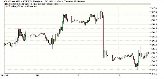 繼前一日的大跌之后,7月12日紐約期棉震蕩調(diào)整,近期10月合約收于85.13美分/磅,跌5點(diǎn);主力12月合約結(jié)算價(jià)85.08美分/磅,漲34點(diǎn)。市場當(dāng)日整體運(yùn)行平穩(wěn),主力12月合約早盤在84.5-85美分間震蕩,后受賣盤跌破84.40美分支撐位,當(dāng)日最低至84.18美分/磅;午盤后少量商業(yè)買盤入市促市場反彈,該合約盤終收于85美分之上。其他合約漲跌互現(xiàn)。