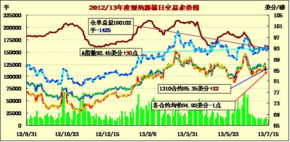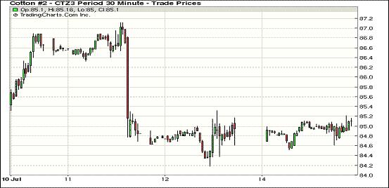 7月15日,紐約期棉近漲遠(yuǎn)跌,10月合約結(jié)算價85.35美分/磅,漲22點(diǎn);主力12月合約結(jié)算價85.10美分/磅,漲2點(diǎn);其他遠(yuǎn)期合約普遍小幅收跌,主要受美國德州將迎來利好降雨打壓。當(dāng)日市場中幅低開,主力12月合約早盤缺乏支持下行至當(dāng)日最低點(diǎn)84.52美分/磅,后買盤入市促該合約反彈,交易后半段整體在84.8-85.1美分之間震蕩,維持盤整格局。遠(yuǎn)期合約在市場炒作遭遇旱情的德州將迎降雨的消息下小幅收跌。分析指出,德州為美國最大產(chǎn)棉州,天氣預(yù)報說該州將迎來強(qiáng)降雨,有助于提高單產(chǎn)和總產(chǎn),這對盤面上的遠(yuǎn)期合約構(gòu)成壓力。