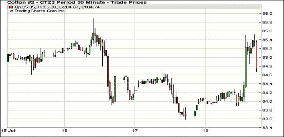 7月18日,紐約期棉在投機(jī)買盤支持下全面反彈,近期10月合約結(jié)算價(jià)84.99美分/磅,漲92點(diǎn);主力12月合約結(jié)算價(jià)84.85美分/磅,漲118點(diǎn);遠(yuǎn)期3月合約收于83.80美分/磅,漲121點(diǎn)。當(dāng)日期棉平穩(wěn)開盤,主力合約上半場(chǎng)主要在84-84.2美分/磅之間震蕩,美棉出口數(shù)據(jù)平平對(duì)市場(chǎng)影響不大,當(dāng)棉價(jià)跌至84美分一線時(shí),投機(jī)買盤及少量基本買盤入市促價(jià)格走高,該合約當(dāng)日最高至85.52美分/磅,盤終雖有所回落,但仍錄得7月1日以來最大單日漲幅。據(jù)美國(guó)農(nóng)業(yè)部(USDA),7.5-7.11一周美國(guó)凈簽約出口本年度陸地棉11431噸,裝運(yùn)29189噸。至本年度末,美棉每周需裝運(yùn)6.9萬噸才能完成年度簽約量。