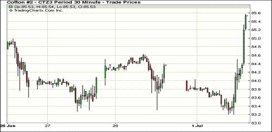 7月1日,受美國6月份PMI數(shù)據(jù)良好支持,美國股市、大豆及原油等商品市場收高,紐約期棉受提振也全線上揚,近期7月合約結算價84.29美分/磅,漲158點;主力12月合約結算價85.54美分/磅,漲153點;其他遠期合約漲幅也均超過百點。當日期棉平穩(wěn)開盤,主力12月合約當日大部分時間在83-84美分/磅之間運行,后美國經(jīng)濟數(shù)據(jù)利好推高外部股市及商品市場,期棉也隨之走高,主力合約盤終收于6月19日以來最高值。市場成交仍較為清淡。據(jù)美國供應管理學會公布,6月份美國制造業(yè)采購經(jīng)理人指數(shù)(PMI)由5月份的49.0升至50.9,顯示制造業(yè)活動擴張,對股市及商品市場形成提振。投資者繼續(xù)關注歐洲央行在本周四召開的會議及美國將于周五公布的非農就業(yè)報告。