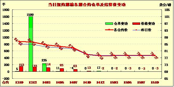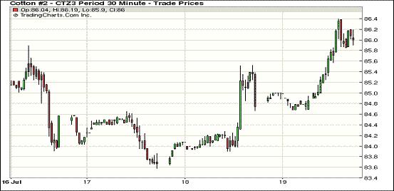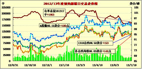 7月19日,在技術(shù)性買盤及市場預(yù)期新花上市前供應(yīng)偏緊支持下,紐約期棉前六份合約延續(xù)前一日漲勢繼續(xù)走高,近期10月合約收于86.52美分/磅,漲153點(diǎn);主力12月合約結(jié)算價86.18美分/磅,漲133點(diǎn);1403月合約收于84.52美分/磅,漲114點(diǎn)。當(dāng)日市場平開高走,主力12月合約早盤一路上揚(yáng),當(dāng)日最高至86.39美分間,后半場基本在86美分一線震蕩,盤終繼7月10日之后首次收于86美分之上。本周1310月合約累計漲139點(diǎn),1312月漲110點(diǎn),1403月漲61點(diǎn)。本周美國最大產(chǎn)棉州德州出現(xiàn)利好降雨,在本周前期打壓期棉連續(xù)收跌;對本周后期市場影響不大,市場擔(dān)心新花上市前供應(yīng)偏緊及技術(shù)性買盤支持市場走高。