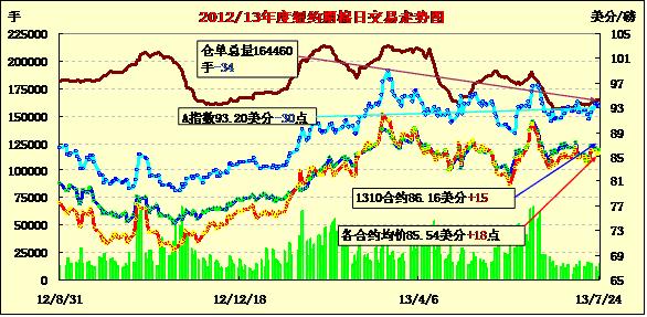 7月24日,雖然美元指數(shù)走高、外部商品市場(chǎng)整體走低,但紐約期棉在非商業(yè)性買盤支持下普遍上漲,近期10月合約結(jié)算價(jià)86.16美分/磅,漲15點(diǎn);主力12月合約結(jié)算價(jià)85.74美分/磅,漲7點(diǎn);遠(yuǎn)期3月合約收于84.18美分/磅,漲14點(diǎn)。當(dāng)日期棉低開后在86美分/磅一線波動(dòng),后外部市場(chǎng)走低拖累期棉下滑,尾盤又在非商業(yè)買盤支持下反彈收高。主力12月合約在84.89-86.13美分/磅之間震蕩,當(dāng)日最高至86.13美分/磅。市場(chǎng)成交量較前一日有所縮小。主力12月合約近期主要在83-87美分震蕩,美棉供應(yīng)偏緊對(duì)市場(chǎng)形成一定支持,但目前中國(guó)買家主要關(guān)注國(guó)儲(chǔ)棉,預(yù)計(jì)期棉市場(chǎng)在拋儲(chǔ)結(jié)束前將繼續(xù)震蕩調(diào)整。