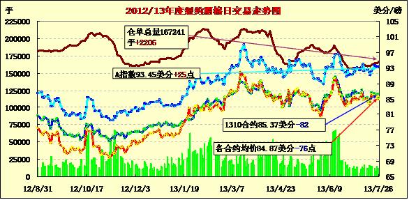 7月26日,紐約期棉未能延續(xù)前兩個交易日的漲勢全面回落,近期10月合約收于85.37美分/磅,跌82點;主力12月合約結(jié)算價85.12美分/磅,跌87點;1403月合約收于83.40美分/磅,跌86點。當(dāng)日主力12月合約早盤走高,后賣盤重回市場打壓該合約回落至86美分/磅以下,午盤后又有一波漲勢,然終不敵市場看空勢頭,盤終各合約全面走低。該合約當(dāng)周的震蕩區(qū)間在84-87美分之間。本周1310月合約累計跌115點,1312月跌106點,1403月跌112點。分析指出,因近期外部谷物市場持續(xù)走低,預(yù)計南半球植棉面積將增加,使得2013/14年度的棉花供應(yīng)量也相應(yīng)增加,對期棉市場造成壓力。