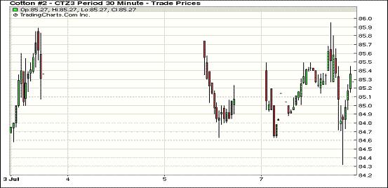 7月8日,在美元走軟、外部商品市場(chǎng)多數(shù)走高及非商業(yè)買(mǎi)盤(pán)的支持下,紐約期棉多數(shù)合約收漲,近期7月合約結(jié)算價(jià)83.83美分/磅,漲15點(diǎn);主力12月合約結(jié)算價(jià)85.33美分/磅,漲30點(diǎn)。主力合約小幅高開(kāi),上半場(chǎng)在非商業(yè)買(mǎi)盤(pán)支持下震蕩走高,午盤(pán)前后至當(dāng)日最高點(diǎn)85.95美分/磅(+92點(diǎn));買(mǎi)盤(pán)獲利平倉(cāng)打壓市場(chǎng)高點(diǎn)回落,交易尾段外部商品走高促期棉反彈,盤(pán)終該合約小幅收漲。市場(chǎng)成交量雖較上周有所增加,但仍較為清淡。