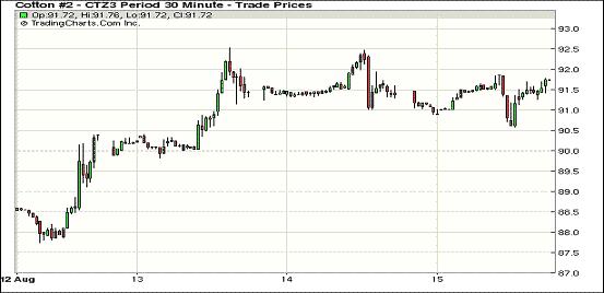 8月15日,受美棉出口數(shù)據(jù)低于市場預期影響,紐約期棉近期合約止跌反彈,遠期合約略有下跌。近期10月合約結算價91.64美分/磅,漲19點;主力12月合約結算價91.79美分/磅,漲24點;遠期3月合約收于88.96美分/磅,漲1點。15日,受美棉出口數(shù)據(jù)低于市場預期影響,ICE期棉近期合約止跌反彈,遠期合約略有下跌。近期10月合約結算價91.64美分/磅,漲19點;主力12月合約結算價91.79美分/磅,漲24點;遠期3月合約收于88.96美分/磅,漲1點。當日期棉小幅低開,主力12月合約午盤前后最高漲127點至91.85美分,后延續(xù)前一日走勢持續(xù)下滑至90.58美分的地位,盤終時略有上漲;大豆和玉米等外部市場大幅走高,美股走低。