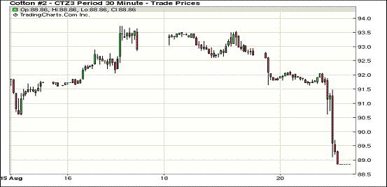8月20日,印度棉花產(chǎn)量高于市場預(yù)估,市場投機(jī)性拋售拖累紐約期棉遠(yuǎn)近合約均大幅下跌;近期10月合約結(jié)算價(jià)88.76美分/磅,跌400點(diǎn);主力12月合約結(jié)算價(jià)88.86美分/磅,跌400點(diǎn);遠(yuǎn)期3月合約收于86.28美分/磅,跌372點(diǎn)。當(dāng)日期棉低開后便持續(xù)震蕩下跌超過200點(diǎn),10月和12月合約盤終時(shí)均跌停,上次主力跌停時(shí)間為2012年6月;主力12月合約自上周五漲至93.32美分的一年半來高位后,20日一路跌破90.00美分,造成大跌的主要原因印度棉花產(chǎn)量高于市場預(yù)估,以及投機(jī)者技術(shù)性拋售。據(jù)美國農(nóng)業(yè)部苗情報(bào)告,德州新花生長狀況略有改善,東南棉區(qū)情況有所惡化,隨ICE期棉大跌,紡企采購將增多。