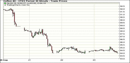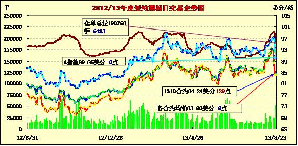 8月23日,紐約期棉主力12月合約小幅下跌,其它遠(yuǎn)近合約漲跌不一;近期10月合約結(jié)算價(jià)84.24美分/磅,漲29點(diǎn);主力12月合約結(jié)算價(jià)84.08美分/磅,跌10點(diǎn);遠(yuǎn)期3月合約收于83.50美分/磅,跌13點(diǎn)。當(dāng)日主力12月合約開盤較前一日明顯上漲,由于期棉連續(xù)四日下跌累計(jì)914點(diǎn),午盤后買家入場(chǎng)抬高該合約價(jià)格,最高漲幅105點(diǎn),盤終略微下跌。美國(guó)密西西比州棉花播種及生長(zhǎng)較遲,但新花生長(zhǎng)狀況良好;后市棉花上漲支撐仍在,預(yù)計(jì)在82-87美分之間震蕩。
