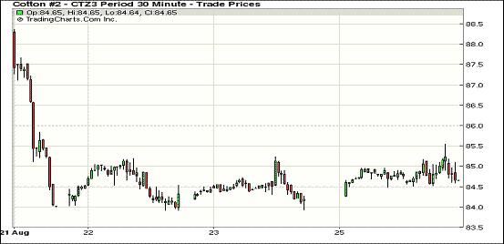 8月26日,紐約期棉遠(yuǎn)近合約普遍上漲;近期10月合約結(jié)算價(jià)85.25美分/磅,漲101點(diǎn);主力12月合約結(jié)算價(jià)84.90美分/磅,漲82點(diǎn);遠(yuǎn)期3月合約收于84.05美分/磅,漲55點(diǎn)。當(dāng)日遠(yuǎn)近合約普遍高開,午盤時(shí)均大幅上漲,主力12月合約在84-86美分之間震蕩,受玉米和大豆等外部谷物市場價(jià)格大幅飆升帶動(dòng),投機(jī)買家入場帶動(dòng)期棉上漲。分析指出,美國格蘭德河流域棉花采摘,德州平原出現(xiàn)利好降雨,加州SJV流域棉花進(jìn)度加快等利好消息,一并促成26日期棉價(jià)格上漲走勢。不過27日期棉價(jià)格可能遭受壓力,因?yàn)槊烂廾缜閳?bào)告顯示,生長狀況良好的棉花比例由上周的46%升至47%。