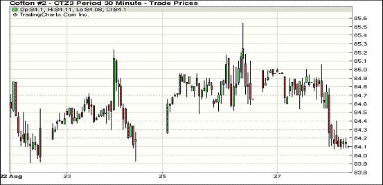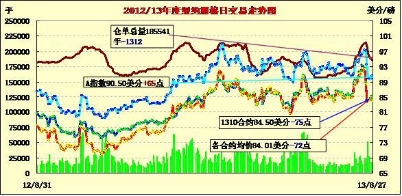 8月27日,紐約期棉全面下跌回吐前一日漲幅,近期10月合約結(jié)算價84.50美分/磅,跌75點;主力12月合約結(jié)算價84.15美分/磅,跌75點;遠(yuǎn)期3月合約收于83.36美分/磅,跌69點。市場在上周的大跌之后進入盤整狀態(tài)。當(dāng)日期棉微幅高開,主力12月合約早盤圍繞84.8美分磅上下波動,當(dāng)日最高至90.39美分/磅;午盤后外部谷物市場走低打壓期棉快速滑落,該合約后半場基本在84.1-84.2美分之間震蕩,盤終收于此區(qū)間之內(nèi)。當(dāng)日外部谷物市場普遍下跌,原油市場收漲。