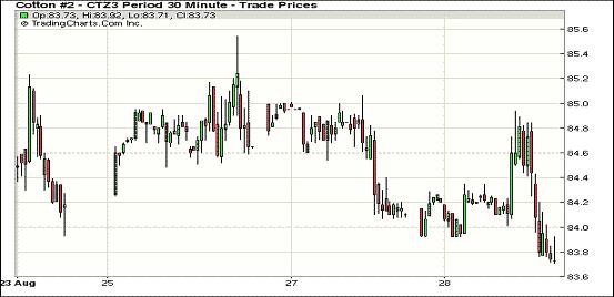 8月28日,紐約期棉遠(yuǎn)近合約均下跌;近期10月合約結(jié)算價(jià)84.01美分/磅 ,跌49點(diǎn);主力12月合約結(jié)算價(jià)83.75美分/磅,跌40點(diǎn);遠(yuǎn)期3月合約收于82.82美分/磅,跌54點(diǎn)。當(dāng)日期棉開盤后略有上漲,午盤后轉(zhuǎn)頭下跌并迅速跌破83.92美分,最低跌至83.72美分,主力12月合約創(chuàng)近五周來(lái)新低。受預(yù)期產(chǎn)量下滑、質(zhì)量下降和降雨致采摘工作推遲等因素影響,印度棉價(jià)創(chuàng)新高,印度和中國(guó)紡企需求過剩。