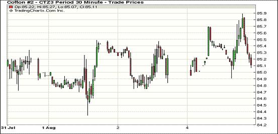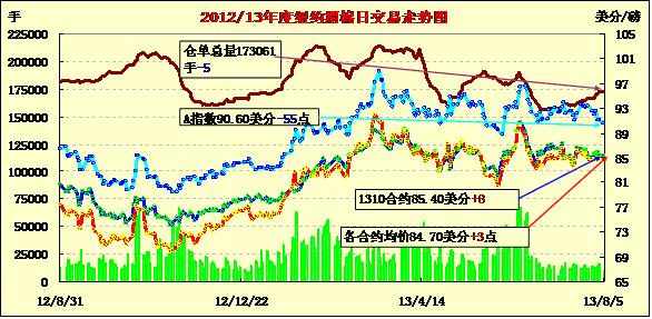 8月5日,紐約期棉各合約止跌反彈小幅收漲,近期10月合約結(jié)算價(jià)85.40美分/磅,漲8點(diǎn);主力12月合約結(jié)算價(jià)85.20美分/磅,漲22點(diǎn);遠(yuǎn)期3月合約收于83.45美分/磅,漲28點(diǎn)。市場(chǎng)成交量較前一日有所放大。當(dāng)日主力12月合約小幅高開(kāi),當(dāng)日整體在85美分以上震蕩,午盤(pán)后跌至當(dāng)日最低點(diǎn)84.91美分(-7點(diǎn)),后在市場(chǎng)多空力量角力下微幅收高。10月合約上漲超過(guò)上周五的85.48美分高點(diǎn),最高升至85.89美分,后有所回落。當(dāng)日外部商品市場(chǎng)整體下滑。當(dāng)日印度向市場(chǎng)投放更多儲(chǔ)備棉與其產(chǎn)棉區(qū)遭受雨水損害多空消息抵消,對(duì)市場(chǎng)影響不大。在7月23日到8月5日之間的10個(gè)交易日內(nèi),12月合約在84.71-85.99美分/磅之間震蕩,預(yù)計(jì)在美國(guó)農(nóng)業(yè)部8月份供需預(yù)測(cè)報(bào)告公布前,該合約繼續(xù)在此區(qū)間內(nèi)盤(pán)整。