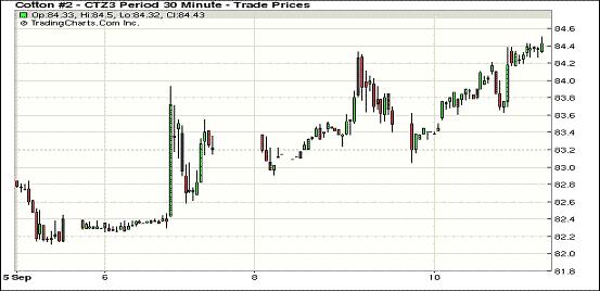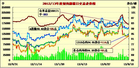 上周持續(xù)于82美分上下震蕩過后,9月10日技術(shù)性買盤繼續(xù)支持紐約期棉連續(xù)第三日上漲;近期10月合約結(jié)算價(jià)84.85美分/磅,漲114點(diǎn);主力12月合約結(jié)算價(jià)84.47美分/磅,漲97點(diǎn);遠(yuǎn)期3月合約收于83.76美分/磅,漲71點(diǎn)。當(dāng)日期棉早盤延續(xù)前一日行情繼續(xù)高開,主力12月在84美分之上徘徊,盤終時(shí)大幅上漲,由于市場(chǎng)等待周四發(fā)布的美棉出口報(bào)告,市場(chǎng)成交量仍較為有限。