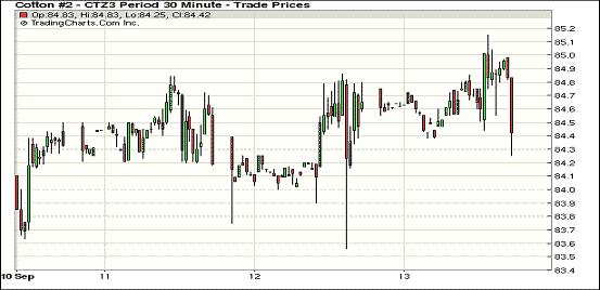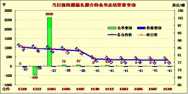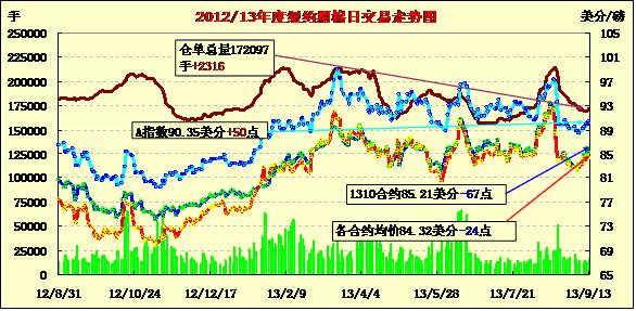 受USDA全球棉花供需預(yù)測報告庫存增加影響,9月13日期棉未能延續(xù)連日上漲普遍下跌;近期10月合約結(jié)算價85.21美分/磅,跌67點;主力12月合約結(jié)算價84.46美分/磅,跌29點;遠(yuǎn)期3月合約收于84.16美分/磅,跌27點。