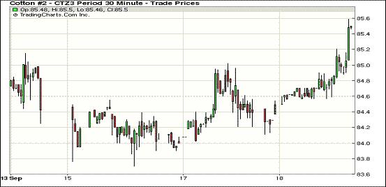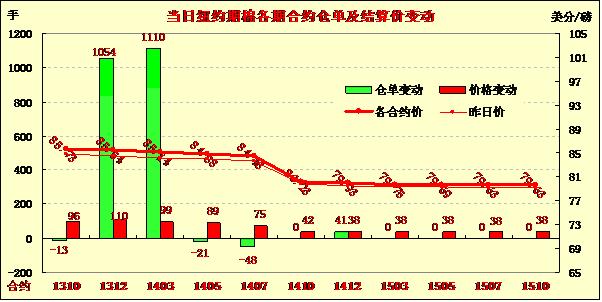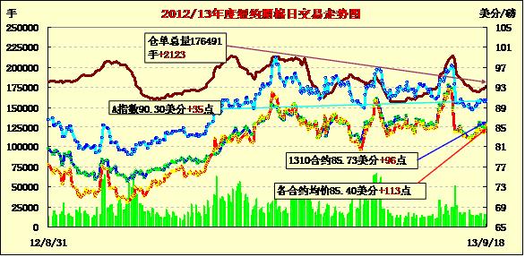 9月18日,因美聯(lián)儲決定推遲縮減購債規(guī)模對商品市場形成整體支持,紐約期棉一個月來最大單日漲幅,近期10月合約收于85.73美分/磅,漲96點;主力12月合約結算價85.54美分/磅,漲110點;1403月合約收于85.14美分/磅,漲99點。當日期棉平穩(wěn)開盤,早盤窄幅區(qū)間震蕩,后美聯(lián)儲政策公布促商品市場上揚,期棉漲勢加速,主力合約當日最高至85.59美分/磅,震蕩幅度148點;盤終該合約收漲110點,為8月中旬以來的最大單日漲幅。12/3月合約價差為40點。