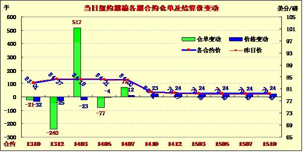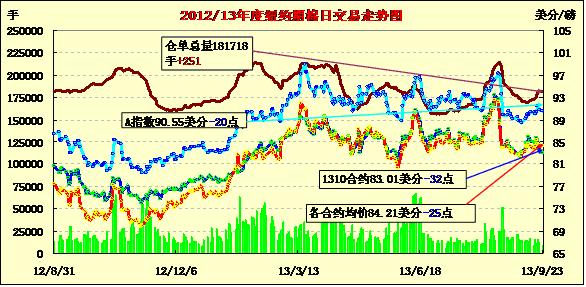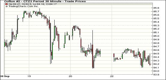 9月23日期棉漲跌不一,近期合約普遍持續(xù)下跌;近期10月合約結(jié)算價83.01美分/磅,跌32點;主力12月合約結(jié)算價84.27美分/磅,跌25點;遠期3月合約收于84.18美分/磅,跌23點。當日棉花消息面平平,期棉開盤延續(xù)前一日走勢小幅上漲,主力12月合約在84.07-85.3美分之間震蕩,盤終時下跌32點收于83.01美分,遠期合約普遍上漲。分析指出,市場缺乏投資者信心支持,不過美元走弱及周二苗情報告為期棉提供部分支撐,全球棉花供應吃緊及中國棉花政策仍對市場形成負面影響。