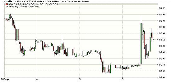 9月6日,紐約期棉在美棉出口數(shù)據(jù)利好的支持下大幅反彈,近期10月合約收于83.24美分/磅,漲84點;主力12月合約結(jié)算價83.21美分/磅,漲91點;1403月合約收于82.59美分/磅,漲70點。