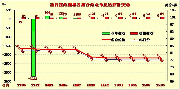 當(dāng)日市場平穩(wěn)開盤,主力12月合約早盤在82.2-82.4美分/磅之間窄幅震蕩,后美棉出口數(shù)據(jù)較前一周大幅增加促市場大幅反彈,該合約至當(dāng)日最高點83.39美分/磅,尾盤時分回吐部分漲幅,盤終仍大幅收漲。本周1310月合約累計跌46點,1312月跌28點,1403月跌15點。