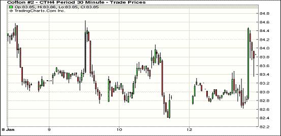 1月13日,紐約期棉結(jié)束三連跌大幅反彈上漲。主力3月合約收于83.68美分/磅,漲109點(diǎn);5月合約結(jié)算價(jià)83.95美分/磅,漲121點(diǎn);1407月合約收于83.74美分/磅,漲127點(diǎn)。當(dāng)日期棉開盤后普遍上漲,盤終近期合約漲幅均在百點(diǎn)以上,主力三月合約在82.62-84.47美分之間震蕩,外部市場(chǎng)普遍上揚(yáng)。當(dāng)日市場(chǎng)上漲因素較多,主要包括美國加州灌溉區(qū)旱情嚴(yán)重,中國政府收儲(chǔ)量跌至兩個(gè)月新低等,預(yù)計(jì)主力合約近期在82-85美分/磅之間震蕩。