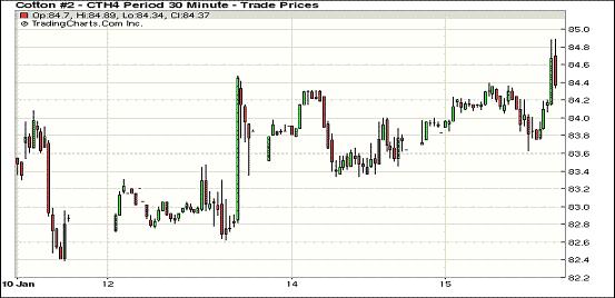 1月15日,在基金買盤支持下,紐約期棉全面走高,1403月合約結(jié)算價(jià)84.79美分/磅,漲106點(diǎn);1405月合約結(jié)算價(jià)84.94美分/磅,漲92點(diǎn);其他遠(yuǎn)期合約漲幅15-64點(diǎn)不等。當(dāng)日期棉平穩(wěn)開盤,主力3月合約上半場(chǎng)圍繞84.2美分/磅震蕩,午盤后下挫至當(dāng)日最低點(diǎn)83.63美分,此時(shí)基金買盤入市促市場(chǎng)反彈上揚(yáng),盤終該合約收于2013年10月17日以來最高值。當(dāng)日外部市場(chǎng)漲跌不一,大豆及原油市場(chǎng)收漲,小麥及玉米走低。在美棉周度報(bào)告公布前,市場(chǎng)預(yù)計(jì)棉花庫存沒有USDA預(yù)計(jì)的那么高,基金買盤押注促使期棉走高,關(guān)注今晚發(fā)布的周度出口數(shù)據(jù)。