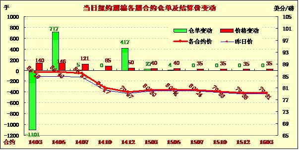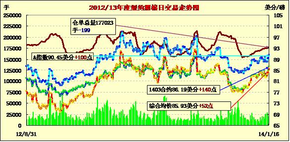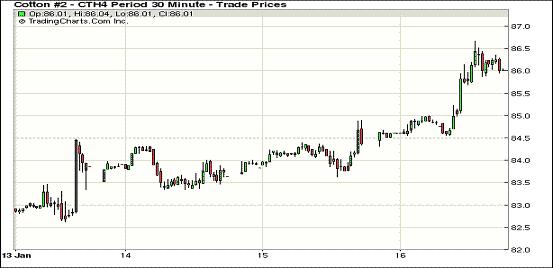 1月16日,在上周美棉出口銷售數(shù)據(jù)強勁的支持下,紐約期棉延續(xù)前一日漲幅大幅走高,1403月合約結算價86.19美分/磅,漲140點;1405月合約結算價86.40美分/磅,漲146點;1407月合約結算價85.87美分/磅,漲121點。期棉當日低開高走,主力3月合約上半場在84.5-85美分/磅震蕩,后美棉數(shù)據(jù)利好促市場上揚,該合約突破85美分阻力位,當日最高至86.67美分,震蕩區(qū)間236點;尾盤時分活躍在86美分一線,盤終收于2013年10月4日以來最高值。市場交易活躍,成交量超過3萬手。