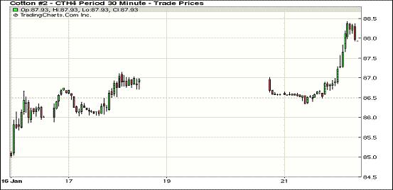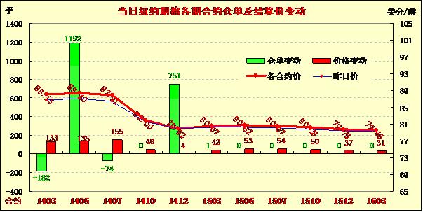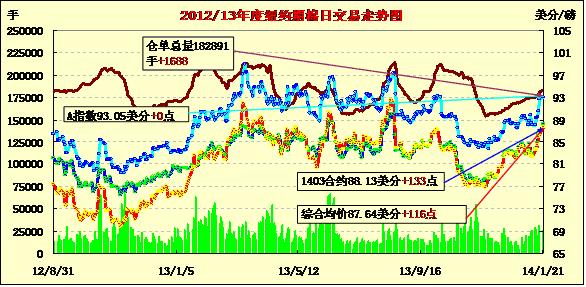 1月21日,因市場擔(dān)憂美棉在2014/15年新花上市前供應(yīng)緊張,紐約期棉連續(xù)第六個交易日收漲,1403月合約結(jié)算價88.13美分/磅,漲133點;1405月合約結(jié)算價88.40美分/磅,漲135點;1407月合約結(jié)算價87.91美分/磅,漲155點。期棉當(dāng)日平開高走,主力3月合約上半場在86.5美分/磅一線震蕩,午盤后在買盤支持下穩(wěn)步上揚,當(dāng)日最高至88.43美分/磅;尾盤時分雖略有回落回吐部分漲幅,盤終仍收于2013年8月20日以來最高值。1412月合約試探80美分未果,盤終收于79.92美分/磅。近期市場對美棉需求持續(xù)活躍,美棉出口銷售數(shù)據(jù)強勁,這促使交易商擔(dān)心在2014/15年新花上市前美棉供應(yīng)緊張,期棉繼續(xù)收漲。