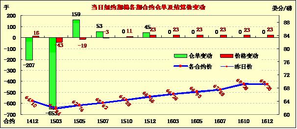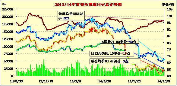 10月10日,盡管USDA報(bào)告下調(diào)美棉產(chǎn)量,由于全球庫(kù)存仍預(yù)期增加,紐約棉價(jià)在報(bào)告發(fā)布后漲跌不一;主力1412月合約結(jié)算價(jià)64.10美分/磅,漲16點(diǎn);1503月合約收于61.84美分/磅,跌43點(diǎn)。當(dāng)日期棉開盤后持續(xù)上漲,最高漲至65.50美分/磅的當(dāng)日高點(diǎn),后在USDA10月份預(yù)測(cè)報(bào)告發(fā)布后有所回落,盤終報(bào)收16點(diǎn),12/3月價(jià)差226點(diǎn);外部商品市場(chǎng)玉米和大豆期貨下跌。USDA最新供需預(yù)測(cè)報(bào)告顯示,由于美棉主產(chǎn)區(qū)預(yù)期減產(chǎn),美棉產(chǎn)量預(yù)計(jì)減20萬(wàn)包至1630萬(wàn)包,出口和消費(fèi)量均較9月份預(yù)測(cè)不變;美國(guó)三角洲和東南棉區(qū)持續(xù)風(fēng)暴降雨,新花采摘將推遲,質(zhì)量預(yù)計(jì)下滑。