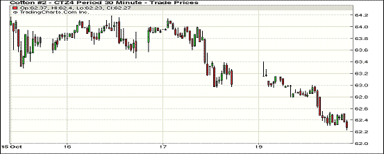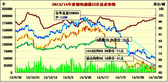 10月20日,美國和印度新花上市,高庫存及銷售不暢打壓市場,期棉繼續(xù)下行,主力合約連續(xù)第五個交易日收跌;主力1412月合約結算價62.29美分/磅,跌71點;遠期1503月合約收于61.70美分/磅,跌3點。當日期棉低開低走,盤終主力合約承壓五連跌,震蕩區(qū)間62.23-63.40美分/磅,12/3月價差進一步縮小至59點,外部市場玉米和大豆收跌。