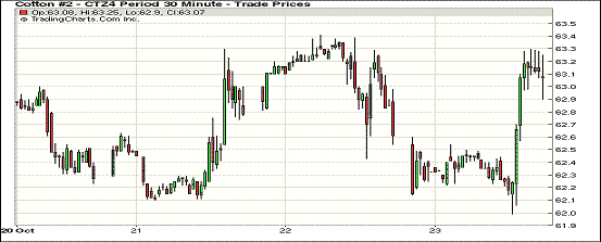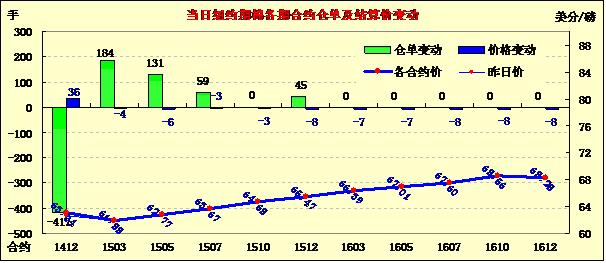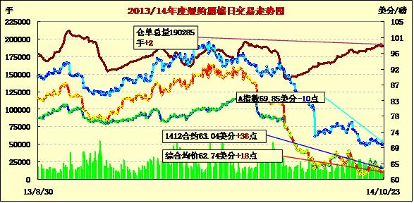 10月23日,紐約期棉先跌后漲,遠(yuǎn)期合約普遍小幅下跌;主力1412月合約結(jié)算價(jià)63.04美分/磅,漲36點(diǎn);遠(yuǎn)期1503月合約收于61.88美分/磅,跌4點(diǎn)。期棉當(dāng)日開盤后受美棉出口報(bào)告數(shù)據(jù)疲軟影響持續(xù)下跌,后主力合約在站穩(wěn)62美分點(diǎn)位后繼續(xù)挑戰(zhàn)63美分并收于該點(diǎn)位之上,12/3月合約價(jià)差116點(diǎn);外部商品市場谷物、油籽期貨及美股均大幅上漲。上周美棉出口數(shù)據(jù)盡管較前一周大幅增加,但仍低于四周均值,簽約量僅為17872噸,裝運(yùn)量22249噸,墨西哥和韓國取消量上升,導(dǎo)致ICE期棉早盤失守,后期隨新花集中上市,棉價(jià)仍將承受巨大供應(yīng)壓力。