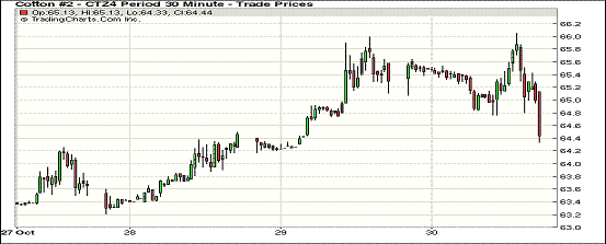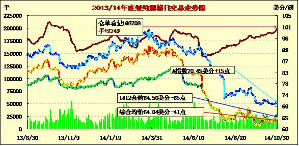 10月30日,棉價(jià)近期合約下跌,遠(yuǎn)期合約小幅上漲;主力12月合約結(jié)算價(jià)64.50美分/磅,跌85點(diǎn);3月合約63.02美分/磅,跌20點(diǎn)。當(dāng)日期棉開(kāi)盤(pán)后震蕩上行并挑戰(zhàn)66.05美分高位,盤(pán)終收跌85點(diǎn),12/3月價(jià)差148點(diǎn);外部市場(chǎng)美元指數(shù)上漲。10.17-10.23一周美國(guó)凈簽約出口本年度陸地棉42048噸,裝運(yùn)16057噸。