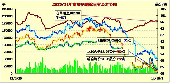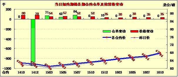 10月1日,棉價在經(jīng)歷連續(xù)數(shù)日下跌過程后中幅反彈;主力1412月合約結(jié)算價62.16美分/磅,漲79點(diǎn);遠(yuǎn)期1503月合約收于60.99美分/磅,漲54點(diǎn)。當(dāng)日期棉早盤遠(yuǎn)近合約普遍上漲,主力合約震蕩區(qū)間61.15-62.33美分/磅,盤終收漲79點(diǎn),登記庫存在連續(xù)六個交易日持穩(wěn)后減少118包。據(jù)中國棉花協(xié)會,預(yù)計(jì)新年度國內(nèi)棉花種植面積連續(xù)第三年下滑。