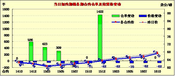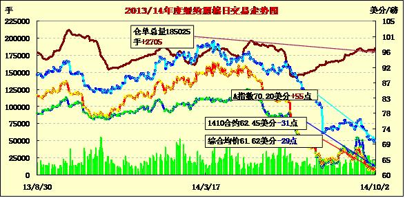 10月2日,紐約期棉普遍下跌,主力合約再創(chuàng)新低;主力1412月合約結(jié)算價61.85美分/磅,跌31點(diǎn);遠(yuǎn)期1503月合約收于60.53美分/磅,跌46點(diǎn)。當(dāng)日期棉開盤后維持弱勢整理,盤終未能延續(xù)前一日漲勢,遠(yuǎn)近合約普遍收跌,外部商品市場玉米、大豆和小麥?zhǔn)諠q。ICAC最新預(yù)計本年度美棉產(chǎn)量365萬噸,較上月調(diào)減4萬噸,出口242萬噸減8萬噸;9.19-9.25一周美國凈簽約出口本年度陸地棉51347噸,裝運(yùn)17599噸,裝運(yùn)量為本年度最低值。