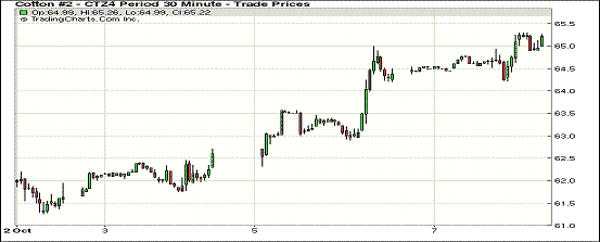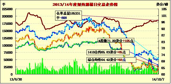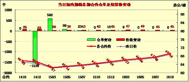 10月7日,受市場(chǎng)供應(yīng)吃緊壓力,紐約期棉延續(xù)前一日漲勢(shì),收于兩周來(lái)高點(diǎn);主力1412月合約結(jié)算價(jià)65.21美分/磅,漲83點(diǎn);遠(yuǎn)期1503月合約收于62.57美分/磅,漲29點(diǎn)。期棉在當(dāng)日開盤后震蕩上行,遠(yuǎn)近合約均普遍上漲,主力12月合約漲至65.29美分高位,盤終收于65美分之上,12/3月價(jià)差264點(diǎn);市場(chǎng)短期供應(yīng)不足、新花采摘推遲以及主產(chǎn)區(qū)天氣條件堪憂等因素推高棉價(jià)。北三角洲地區(qū)出現(xiàn)風(fēng)暴天氣,局部地區(qū)冰雹,亞利桑那州采摘落后于去年同期,不過(guò)由于新棉即將上市,遠(yuǎn)期棉價(jià)仍面臨巨大下行壓力。