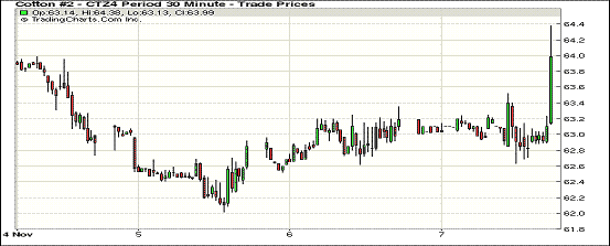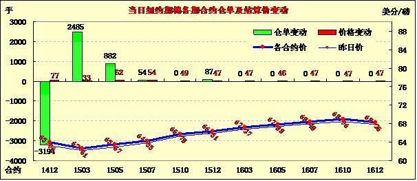 11月7日紐約期棉合約早盤(pán)下跌,盤(pán)尾小幅收漲,主力1412月合約結(jié)算價(jià)63.96美分/磅,漲77點(diǎn),遠(yuǎn)期1503月合約收于62.61美分/磅,漲33點(diǎn)。當(dāng)日開(kāi)盤(pán)后銷(xiāo)售壓力顯現(xiàn),近期合約承壓,大部分合約呈下行趨勢(shì),盤(pán)終整體收漲。3月合約繼續(xù)在61.20美分/磅一線上小幅震蕩,12/3月價(jià)差擴(kuò)大。