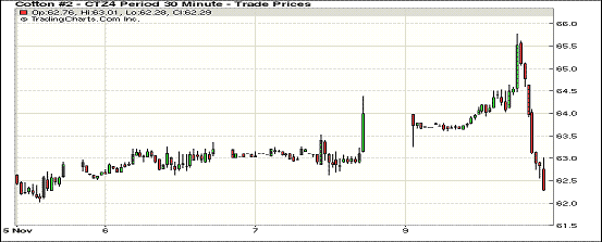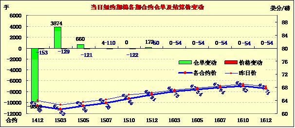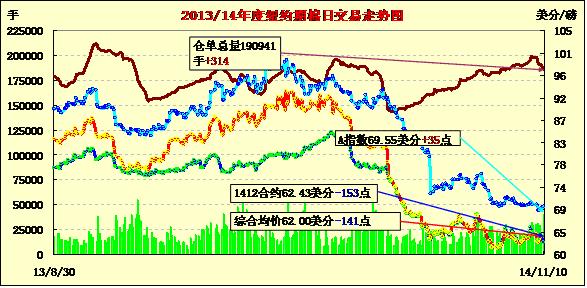 11月10日,紐約期棉受華盛頓供需報(bào)告影響,所有合約下跌,主力合約創(chuàng)近半個(gè)月來最大跌幅,成交量增加;主力1412月合約結(jié)算價(jià)62.43美分/磅,跌153點(diǎn);遠(yuǎn)期1503月合約收于61.32美分/磅,跌129點(diǎn)。當(dāng)日期棉開盤后小幅上漲,后在USDA最新供需報(bào)告的影響下,所有合約收跌,12月至10月合約跌幅均超100。12/3月合約價(jià)差111點(diǎn)。外部市場大豆玉米收漲。周一美國農(nóng)業(yè)部發(fā)布最新供需預(yù)測,預(yù)計(jì)年末庫存、消費(fèi)、產(chǎn)量較10月均有所增加,截至當(dāng)日美國新花采摘進(jìn)度62%。