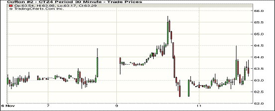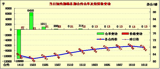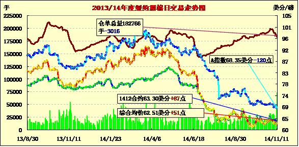 11月11日,紐約期棉合約觸底反彈,期棉全線(xiàn)上漲;主力1412月合約結(jié)算價(jià)63.30美分/磅,漲87點(diǎn);遠(yuǎn)期1503月合約收于61.53美分/磅,漲21點(diǎn)。當(dāng)日期棉合約低開(kāi)高走,主力合約最高價(jià)64.50美分/磅,盤(pán)尾回落。12/3月合約價(jià)差進(jìn)一步擴(kuò)大至177點(diǎn)。外部市場(chǎng)大豆玉米收漲。11月供需報(bào)告預(yù)測(cè),2014/15年度新花較上月增加,年末庫(kù)存增加,棉價(jià)依然處于長(zhǎng)期跌勢(shì)。