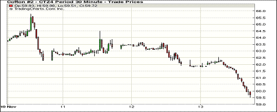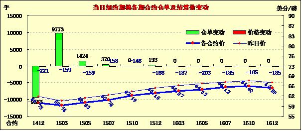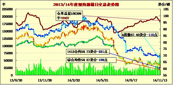 11月13日紐約期棉合約繼續(xù)下跌,大部分合約跌幅超過(guò)150點(diǎn),部分合約超過(guò)200點(diǎn),12月至5月合約均收于60美分/磅以下;近期1412月合約結(jié)算價(jià)59.73美分/磅,跌221點(diǎn),主力1503月合約收于58.75美分/磅,跌159點(diǎn)。當(dāng)日開(kāi)盤(pán)后紐約期棉合約延續(xù)了前一日的跌勢(shì),近期合約早盤(pán)下跌100點(diǎn)左右,主力合約震蕩幅度較小。3/12月合約價(jià)差98點(diǎn)。新年度印度將取代中國(guó)成為世界第一棉產(chǎn)量大國(guó),日前印度棉協(xié)調(diào)增2014/15年度預(yù)計(jì)產(chǎn)量,USDA對(duì)印度供需沒(méi)做任何調(diào)整,供需壓力再度顯現(xiàn)。外部市場(chǎng)收跌。