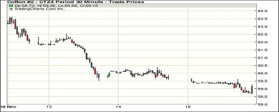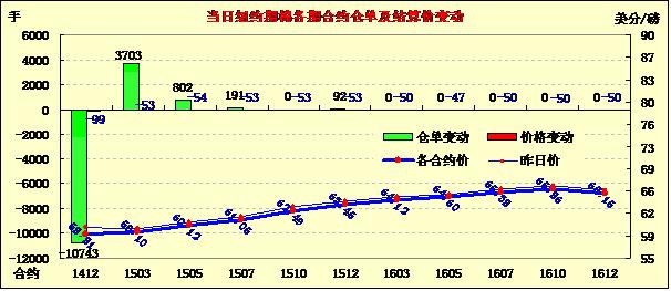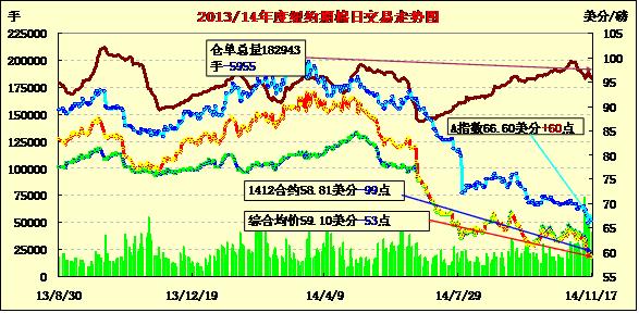 周一紐約期棉反彈失敗,所有合約下跌,12/3月合約收于69美分/磅左右;近期1412月合約結(jié)算價58.81美分/磅,跌99點(diǎn),主力1503月合約收于59.10美分/磅,跌53點(diǎn)。期棉飄紅僅在周五曇花一現(xiàn),周一期棉再次下跌,主力合約低開低走,12月合約再創(chuàng)新低,登記庫存繼續(xù)增加。12/3月合約價差29點(diǎn)。