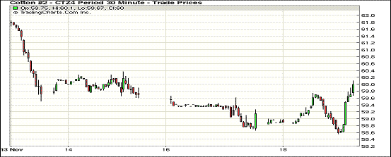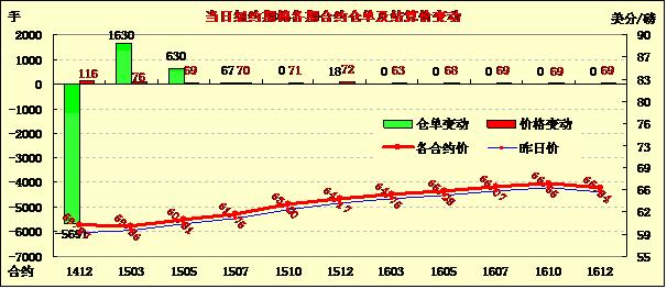 11月18日紐約期棉反彈上漲,收盤價(jià)為上周四來(lái)最高;近期1412月合約結(jié)算價(jià)59.97美分/磅,漲166點(diǎn),主力1503月合約收于59.86美分/磅,漲76點(diǎn)。當(dāng)日期棉開盤后走勢(shì)震蕩,午盤合約價(jià)小幅下跌,但最終收漲,阻力線為60美分/磅。12/3月合約價(jià)差9點(diǎn)。