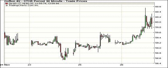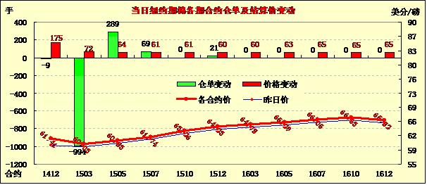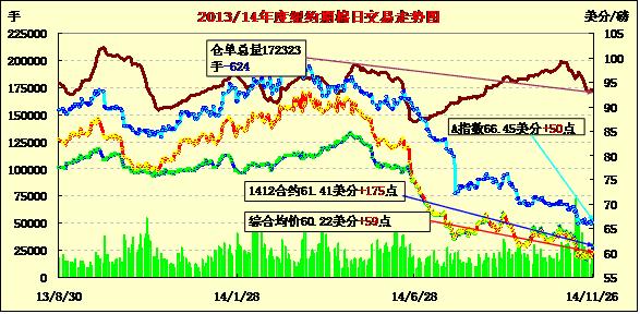 11月26日紐約期棉連續(xù)第二日上漲,合約價(jià)重回60美分,近月合約漲幅較大;1412月合約結(jié)算價(jià)61.41美分/磅,漲175點(diǎn),主力1503月合約收于60.03美分/磅,漲72點(diǎn)。當(dāng)日開盤后主力合約震蕩上行,午后沖高,最高價(jià)60.55美分,最終收復(fù)60美分一線,漲幅1.21%。12/3月合約價(jià)差擴(kuò)大,為138點(diǎn)。周二和周三全球股市上漲刺激紐約期棉反彈,但在供應(yīng)和庫存壓力下,棉價(jià)長(zhǎng)期內(nèi)難有作為。