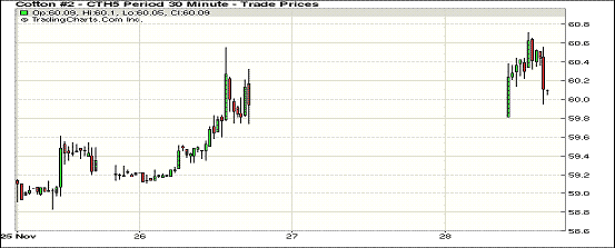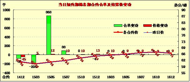 11月28日,除12月合約外,其它合約繼續(xù)小幅回升;1412月合約結(jié)算價(jià)60.96美分/磅,跌45點(diǎn),主力1503月合約收于60.08美分/磅,漲5點(diǎn)。當(dāng)日為紐約期棉連續(xù)第三日上漲,主力合約最高價(jià)60.71美分,最終反彈乏力,收漲5點(diǎn),漲幅0.08%。12/3月合約價(jià)差為88點(diǎn)。周五美棉出口數(shù)據(jù)保持強(qiáng)勁,但對(duì)紐約期棉刺激有限。本月最后一個(gè)交易日主力合約收漲,但較本月初下跌284點(diǎn)。11.14-11.20一周美國(guó)凈簽約出口本年度陸地棉69332噸,較上周增加77.7%,裝運(yùn)24403噸,較上周增加71.9%,均為本年度最高值。