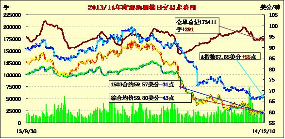 12月10日,USDA報告顯示全球期末庫存升至新高,紡企消費量低于產(chǎn)量,紐約期棉普遍下跌;1503月合約結(jié)算價59.57美分/磅,跌31點;1505月合約收于60.18美分/磅,跌45點。當(dāng)日期棉先漲后跌,主力3月合約在60美分以上震蕩調(diào)整,盤終收于該點位上方,結(jié)束連日上漲。據(jù)USDA12月份預(yù)測報告,本年度全球產(chǎn)量2590.5萬噸,較上月預(yù)測減13.7萬噸